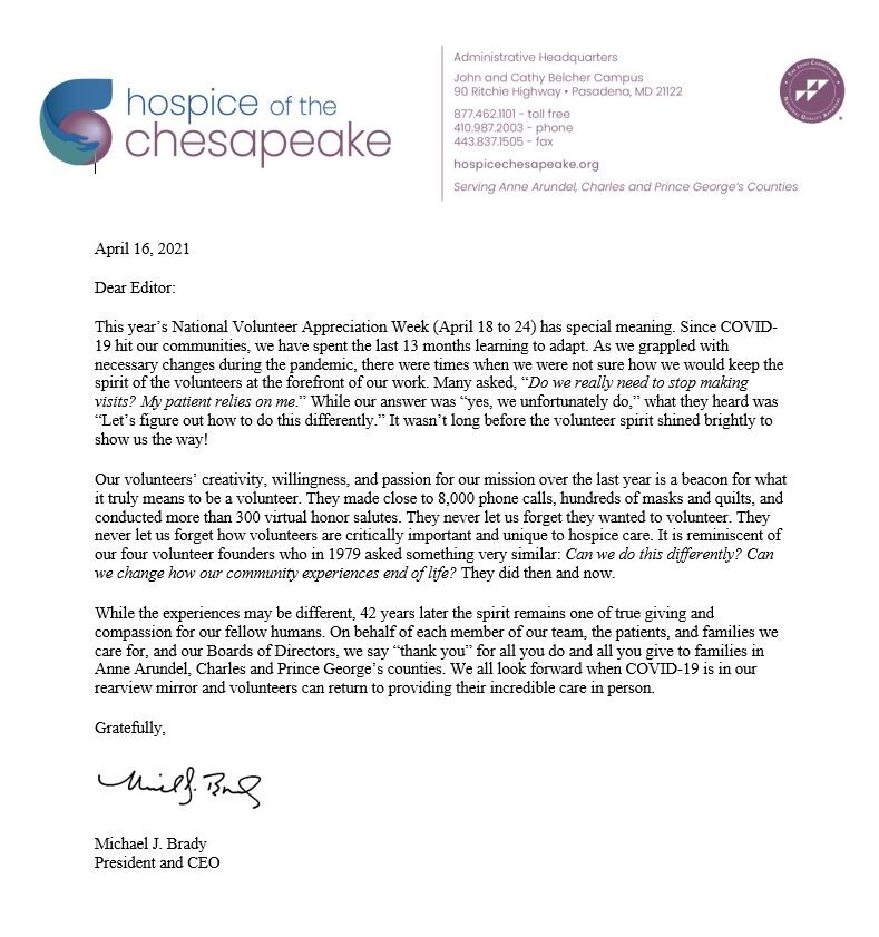 According to its website Hospice of the Chesapeake's mission is to "provide physical, psycho-social and spiritual support services to individuals living with and affected by advanced illness. These services are provided wherever the patient calls home. Hospice of the Chesapeake is committed to providing the best possible care for all regardless of their inability to pay."