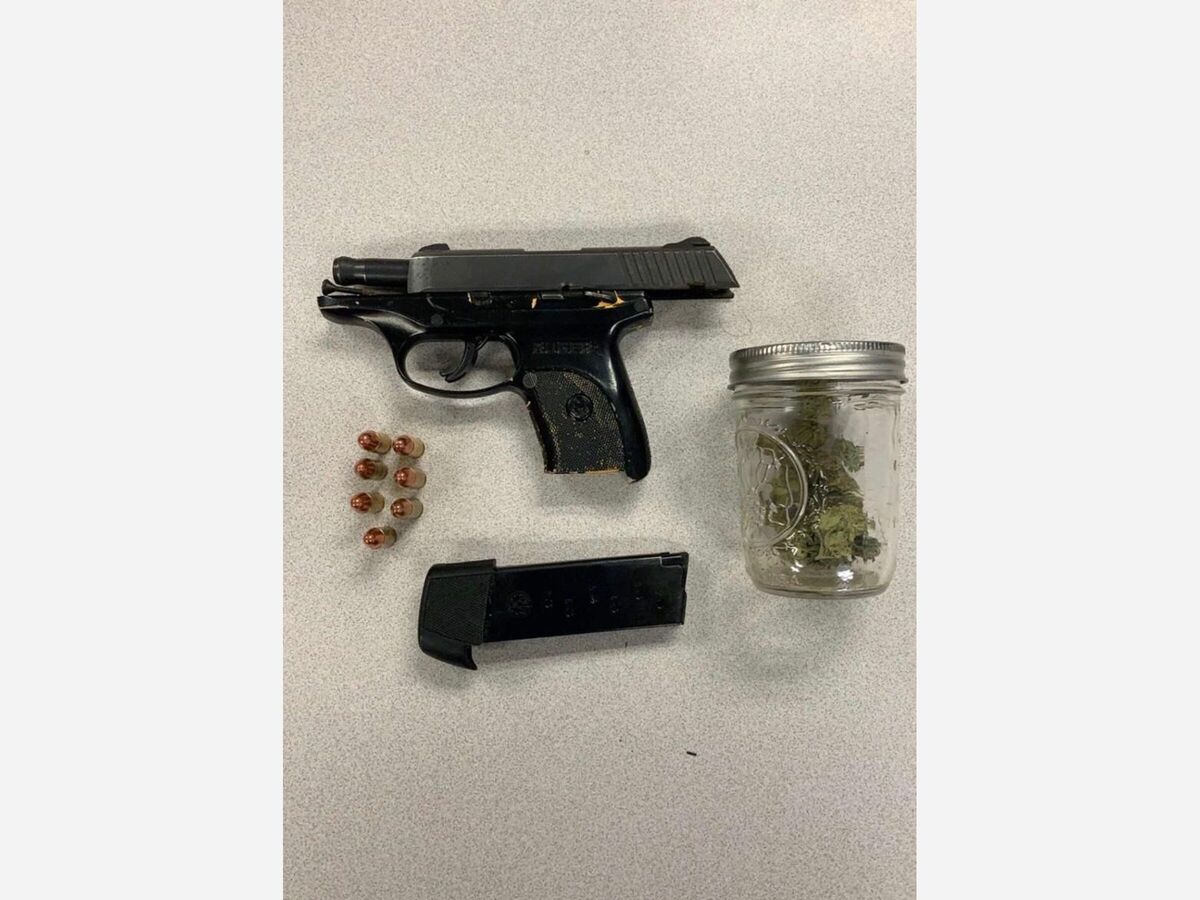 Upon approaching the vehicle the officer observed a jar containing suspected marijuana in plain view within the vehicle. The investigation led to a search of the vehicle which resulted in the seizure of a 9mm Luger LC handgun loaded with seven rounds of ammunition.